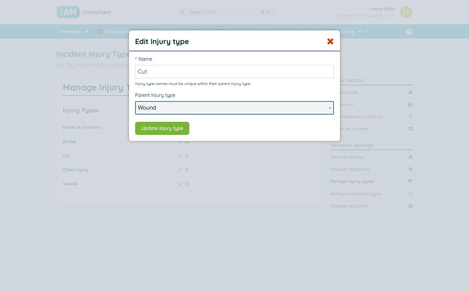 3. In the "Injury type" section you can edit what information will be required and enabled for the different affected person types for incidents recorded at your organisation