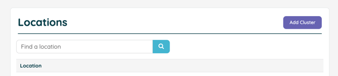 To create a Cluster, account owners can visit their Settings page > navigate to the Locations area > Click "Add Cluster" at the top: